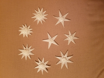 I thought some of Dan's handiwork might be good for one of our first posts - (although it is not there yet!) The star design in the center of the photo above is a design from the famous origami artist and author, John Montroll. Dan, based on John's design, created stars with additional points as well in the circle around the center star. :) Each of these fairly intricate stars is made from one perfectly square piece of paper!